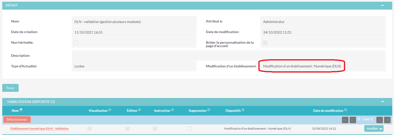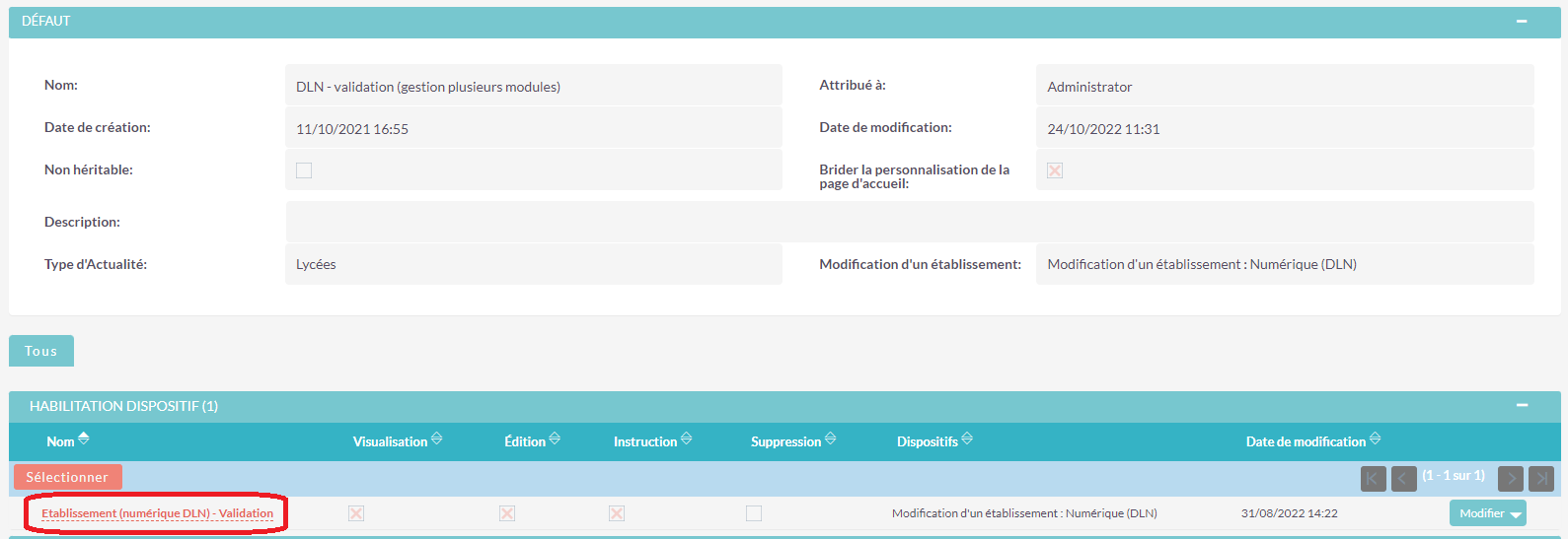 • L’habilitation s’ajoute dans le sous-panel, vérifiez que la propriété Edition est cochée, si ce n’est pas le cas cliquez sur Modifier puis cochez cette propriété