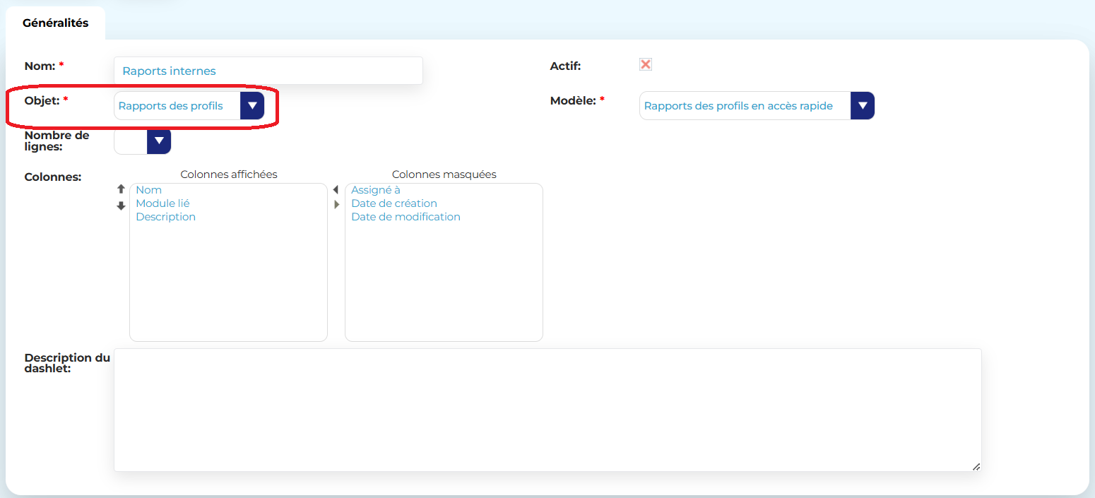 - Ordre : saisissez un numéro pour positionner verticalement le dashlet dans l’onglet parmi les autres dashlets