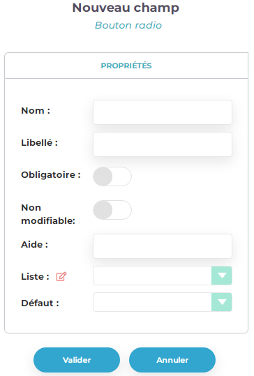 - Libellé : nom du champ tel qu’il apparaîtra dans la palette et dans les dossiers, s’il n’est pas renseigné le « nom » est alors utilisé
