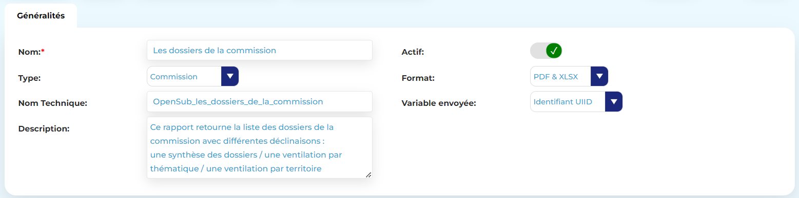 - Actif : cochez cette propriété pour rendre le rapport visible et utilisable