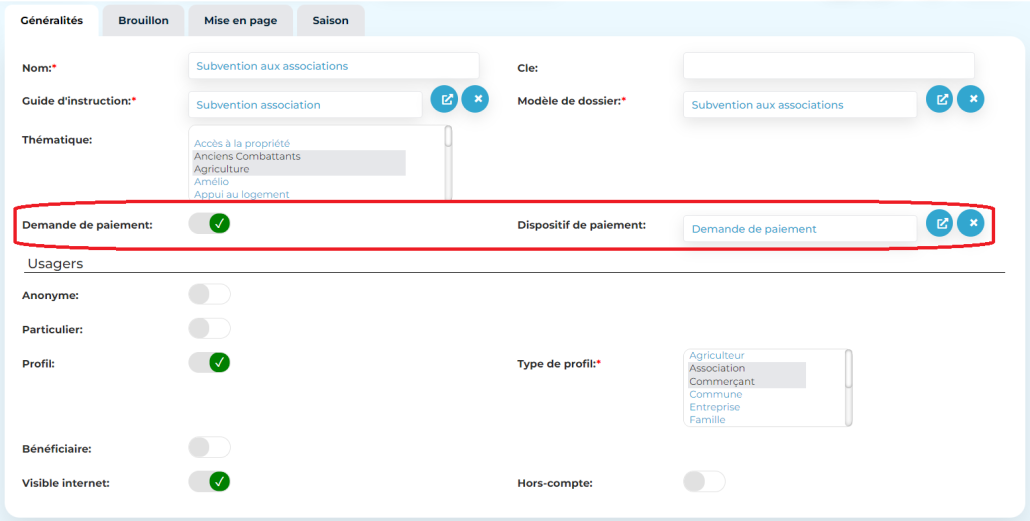 - Ajoutez à minima les champs Type de paiement et Intitulé paiement pour permettre à l’usager d’indiquer respectivement s’il s’agit d’un paiement ou d’une recette, et de préciser s’il souhaite une avance un acompte ou le solde de la subvention