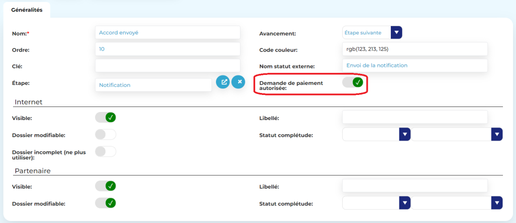 - Accédez à l’étape et au statut pour lequel vous souhaitez autoriser une demande de paiement