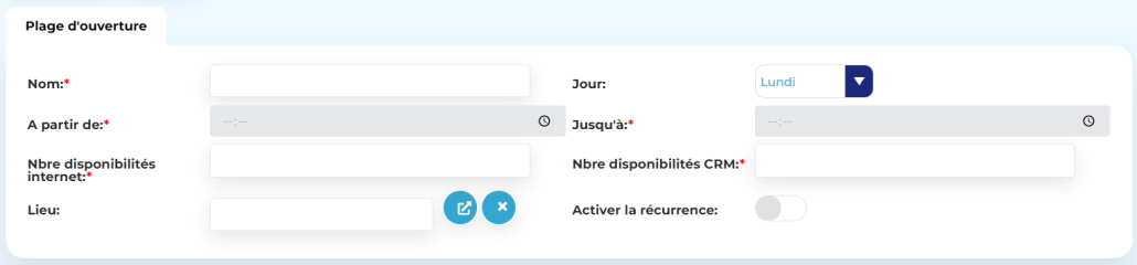 - Lieu : sélection du lieu associé à la plage d’ouverture