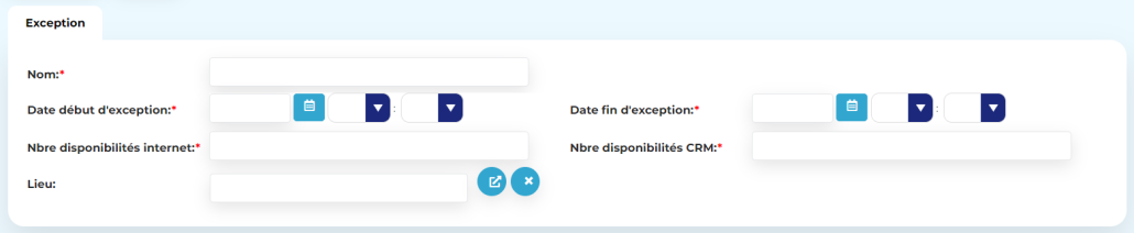 - Date début d’exception / Date fin d’exception : période sur laquelle porte l’exception, celle-ci peut couvrir plusieurs jours
