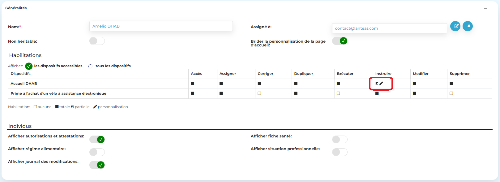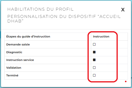 Il est possible d’affecter des droits de gestion d’un dossier à un utilisateur uniquement à certaines étapes d’instruction de celui-ci, au travers d’habilitations partielles.