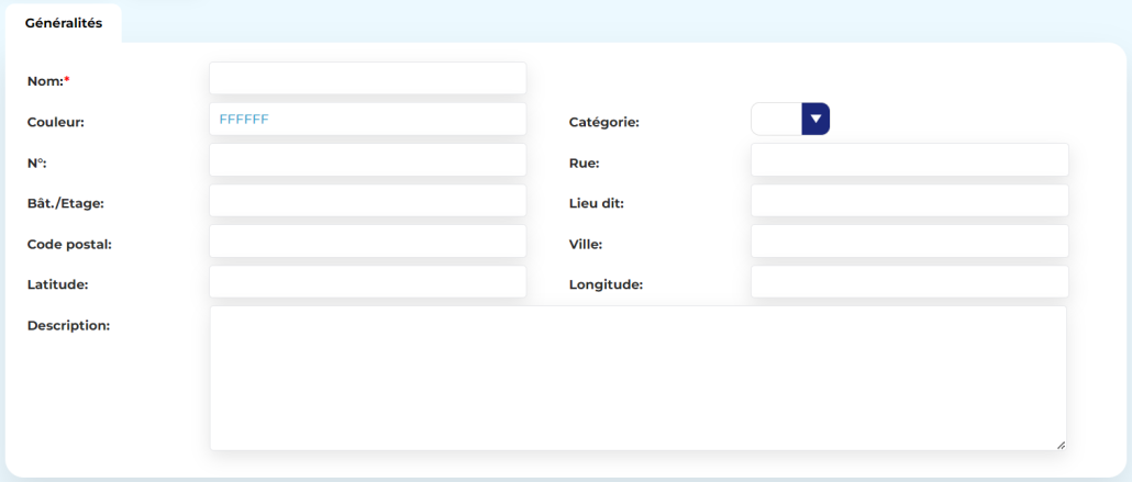 - Adresse : définition précise de lieu, un couplage avec l’API BAN permet de vérifier la saisie et de récupérer les coordonnées géographiques (Latitude et Longitude)