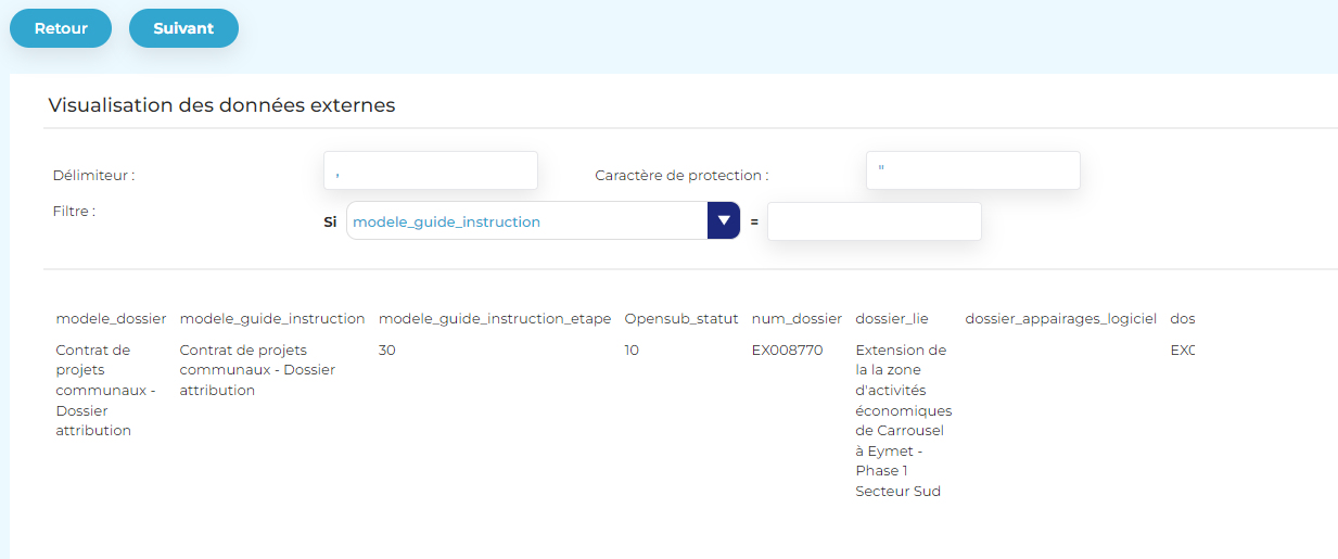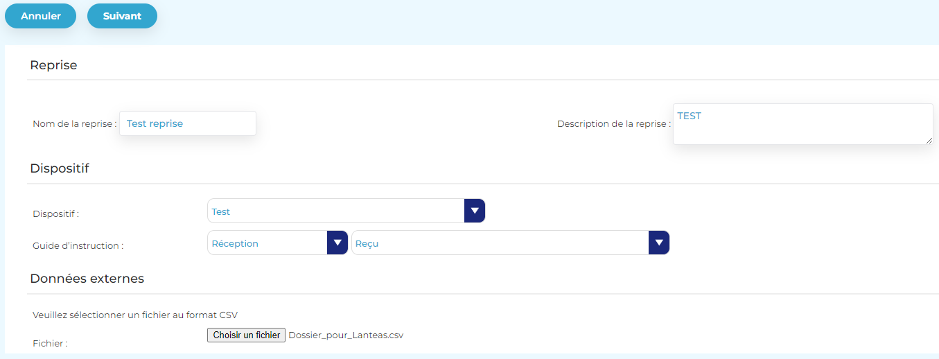 L’import de dossiers s’appuie sur un modèle permettant de configurer un scénario de reprise à partir d’un fichier de données au format CSV.