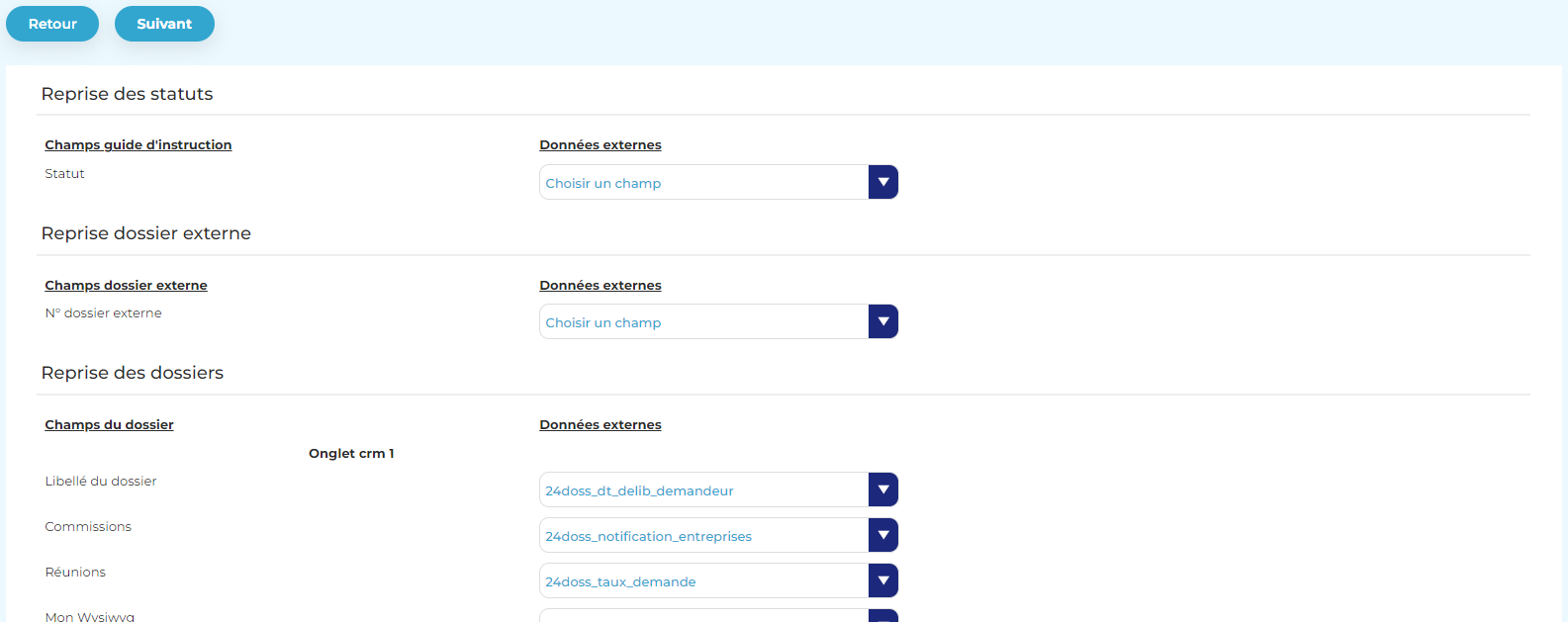 • Champs du dossier : l’écran affiche automatiquement les champs du modèle de dossier lié au dispositif, il faut alors sélectionner en face de chacun la colonne du fichier de reprise contenant l’information voulue, si cette colonne existe