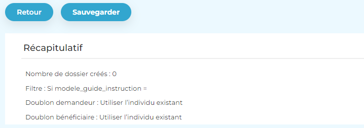 • Guide d’instruction : indiquez l’étape d’instruction et le statut à mettre par défaut sur les dossiers dans le cas où le fichier de reprise ne précise pas de statut