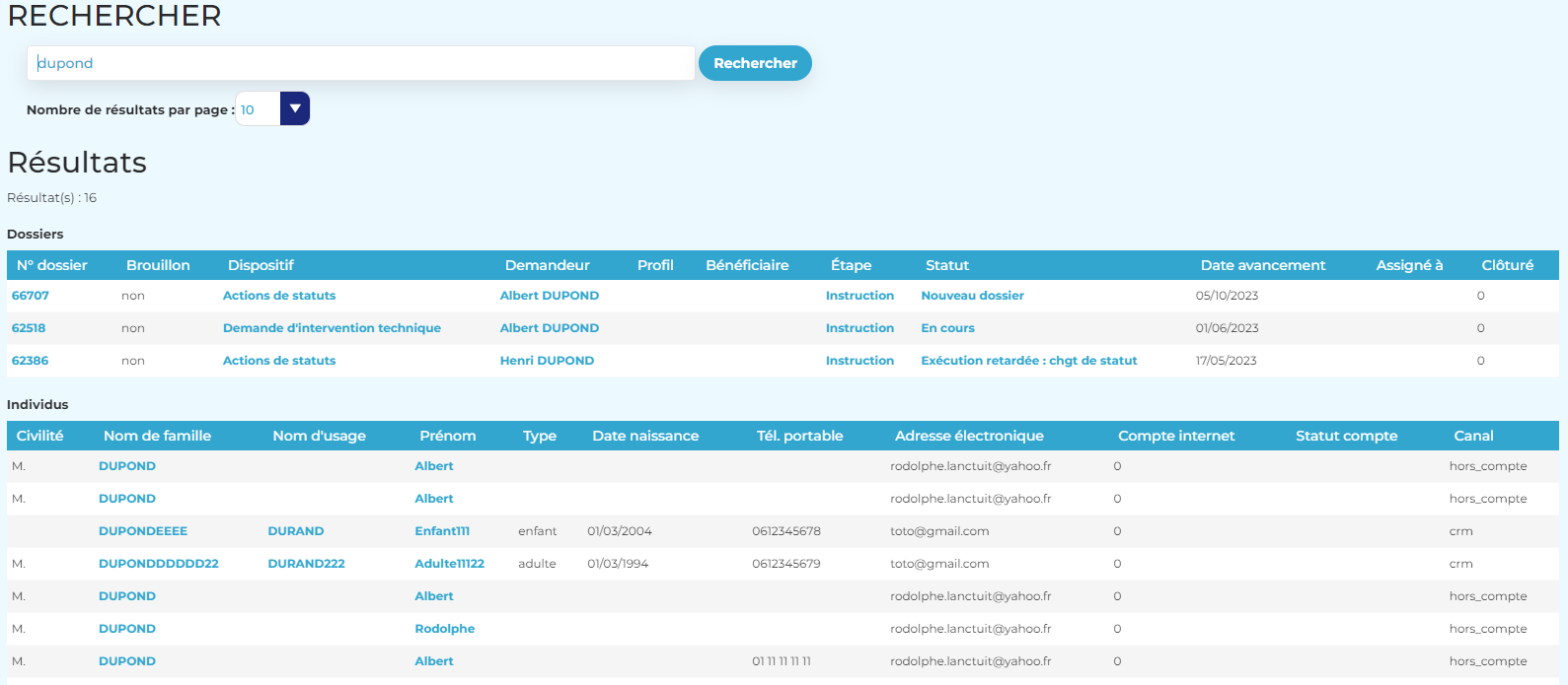 En tapant « dupond » dans la barre de recherche en haut à droite de l’écran, le CRM retourne un résultat présenté sous forme de blocs.
