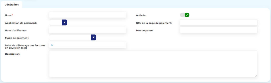 • URL de la page de paiement : indiquez l’URL du tiers bancaire vers laquelle l’usager  est automatiquement redirigé lorsqu’il clique dans une facture sur le bouton Payer maintenant