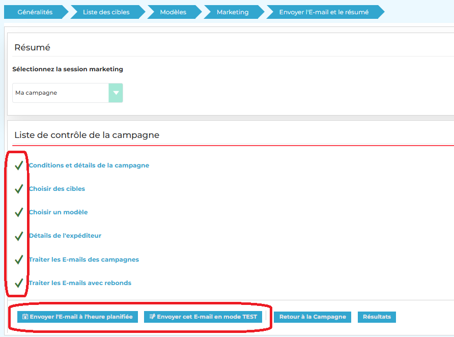 - Vérifiez dans la Liste de contrôle de la campagne que tous les indicateurs sont au verts; Dans la négative, cliquez sur l’onglet approprié pour revenir en arrière et compléter ou corriger la saisie
