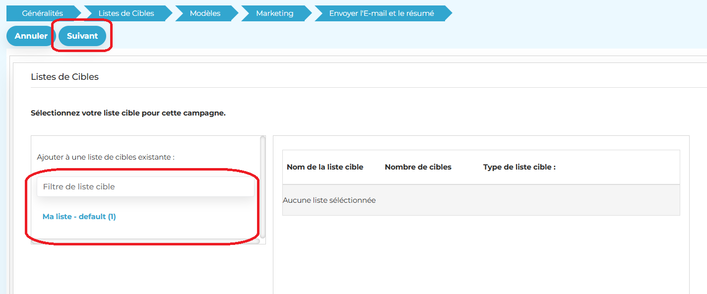 - Cliquez sur la liste de cibles souhaitée pour la prendre en compte, elle se retrouve alors ajoutée dans la partie droite de l’écran