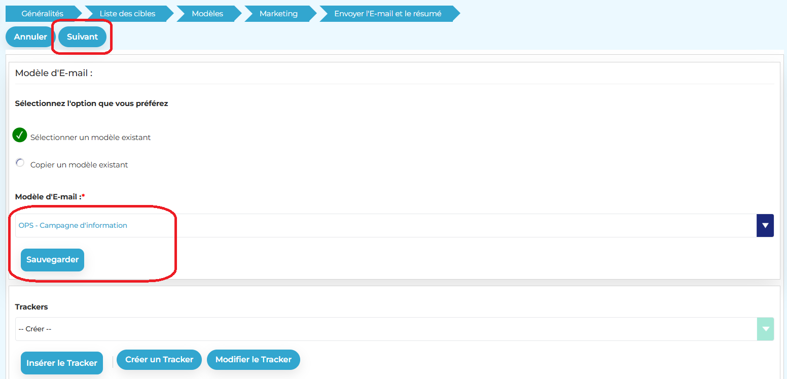 - Sélectionnez un modèle de mail puis cliquez sur Sauvegarder