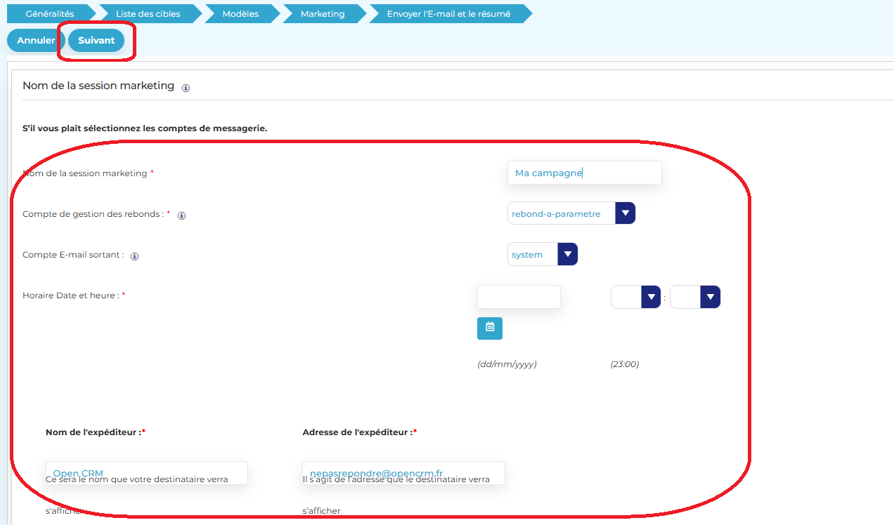 IV – Configurez l’envoi (onglet Nom de la session Marketing)