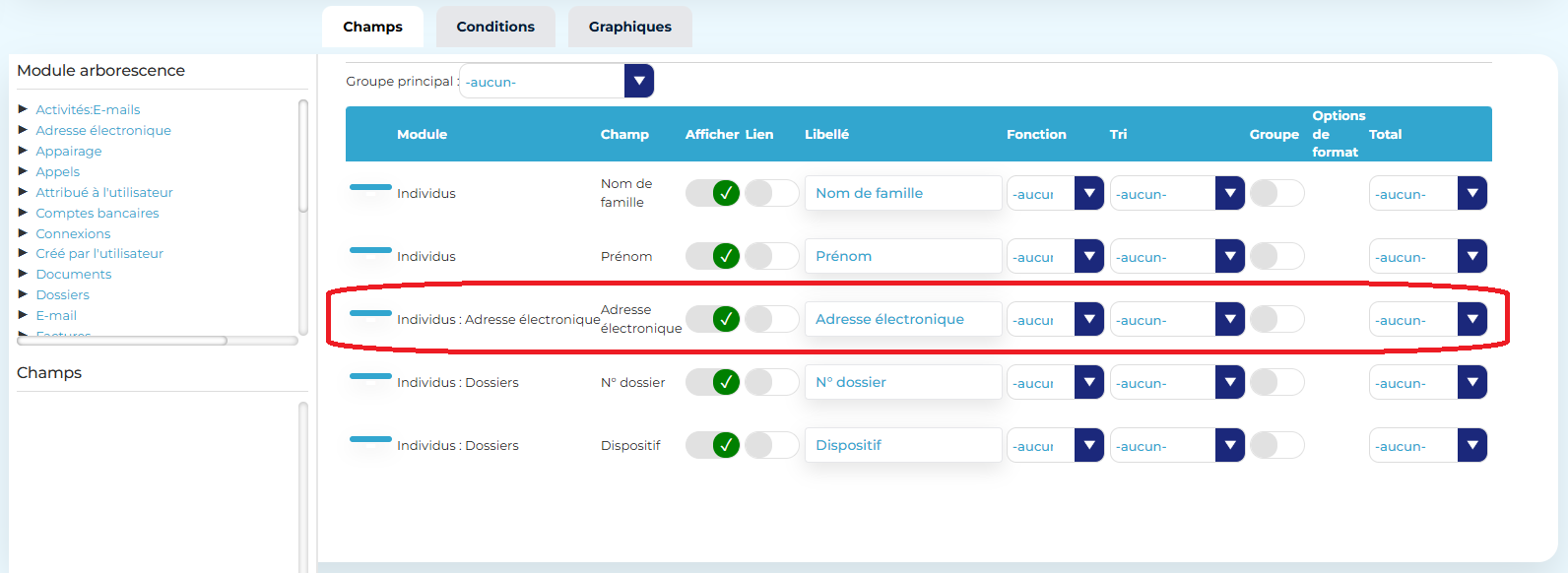 - En dessous dans le bloc Champs (Adresse électronique), cliquez sur Adresse électronique pour venir insérer ce champ dans la partie centrale du rapport