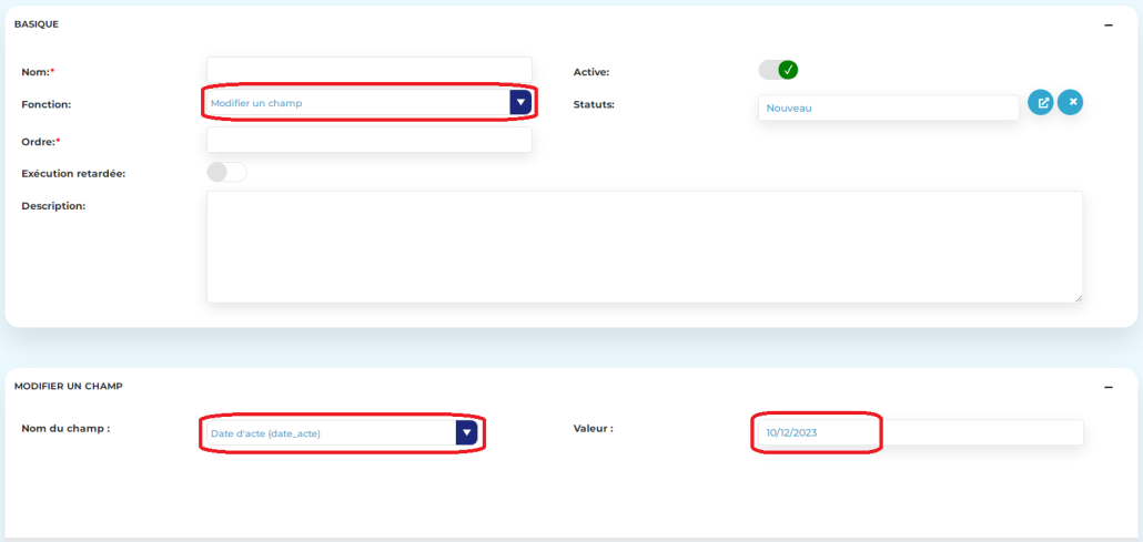 - Dans le nouvel écran, dans la liste déroulante Fonction, sélectionnez l’action Modifier un champ