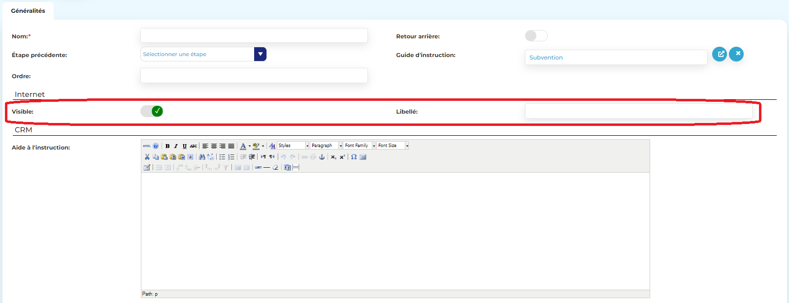 - Si vous souhaitez afficher l’étape mais avec un terme différent de celui de l’utilisateur du CRM, cochez Visible et saisissez le terme souhaité dans Libellé
