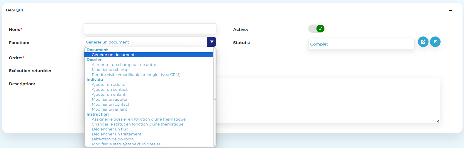 | Modifier un champ | Permet d’affecter une valeur statique à un champ du dossier. |
