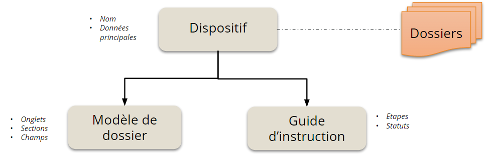 Une fois créé, les utilisateurs peuvent saisir des dossiers sur ce dispositif au travers d’un modèle de dossiers, puis instruire ces dossiers grâce à un guide d’instruction.
