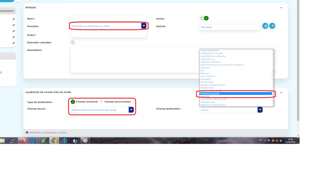 - Sélectionnez le Champ destination, le contenu de la liste déroulante varie selon le choix fait dans le Type de destination