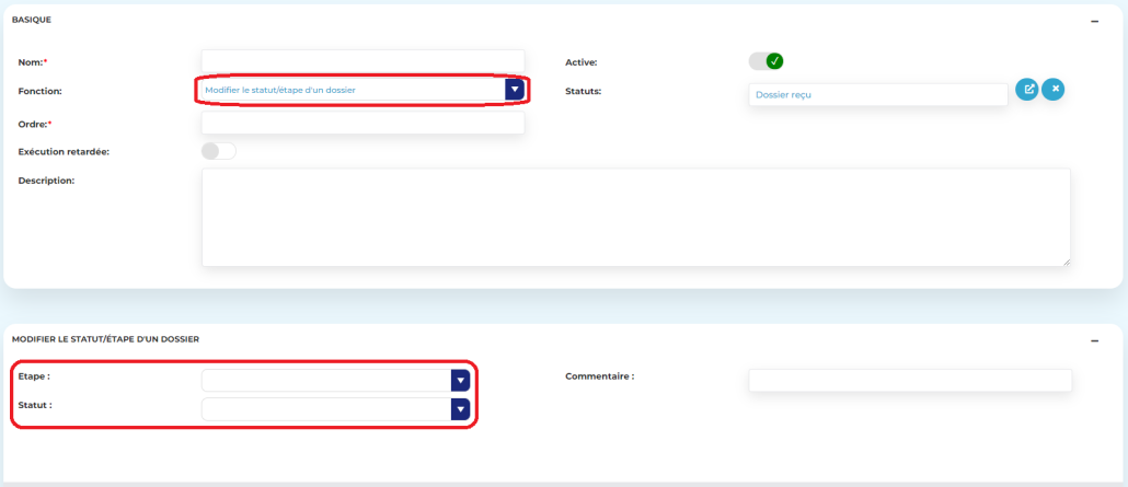 - Dans le nouvel écran, dans la liste déroulante Fonction, sélectionnez l’action Modifier le statut/étape d’un dossier