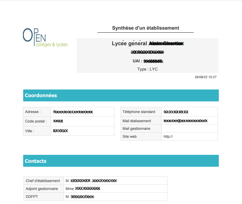 - Les données principales : identité de l’établissement, l’académie, l’adresse et les moyens de contact … etc